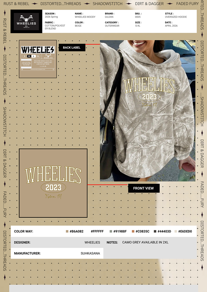 Women's Oversized Beige Camo Hoodie with Wheelies name and est 2023 on front in puff/textured white Varsity font.
